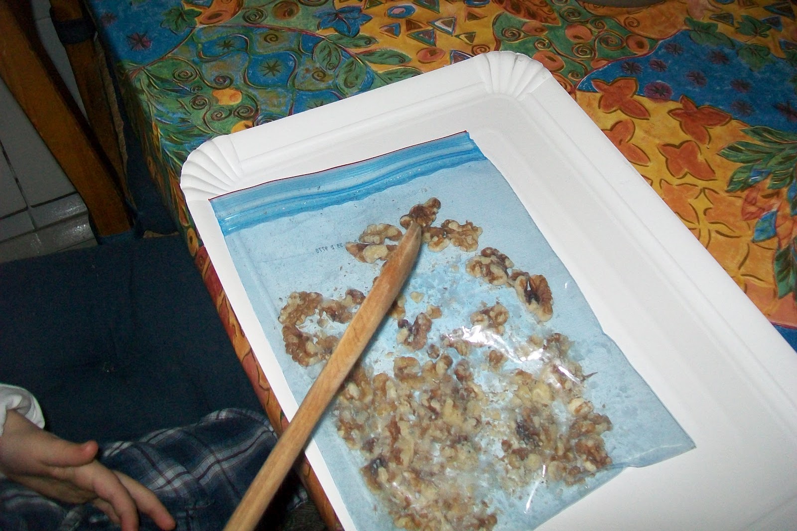 Instrucciones: Muy importante pre-calentar el horno a 180ºC. Pon nueces en la bolsa cerrada y dejar que los niños la golpeen con la cuchara de madera para romperlas en pedazos pequeños. Explicar que después de ser arrestado Jesús fue golpeado por los soldados romanos. Leer Juan 19: 1-3.