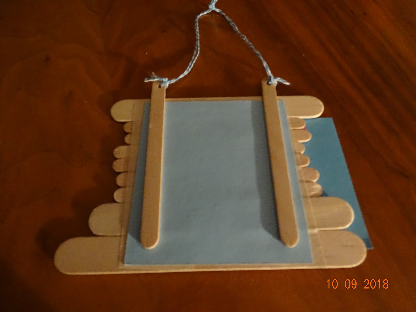 Por detrás como se puede ver he puesto dos palitos mas estrechos con un agujero para pasar una cuerda para poder colgarlo.