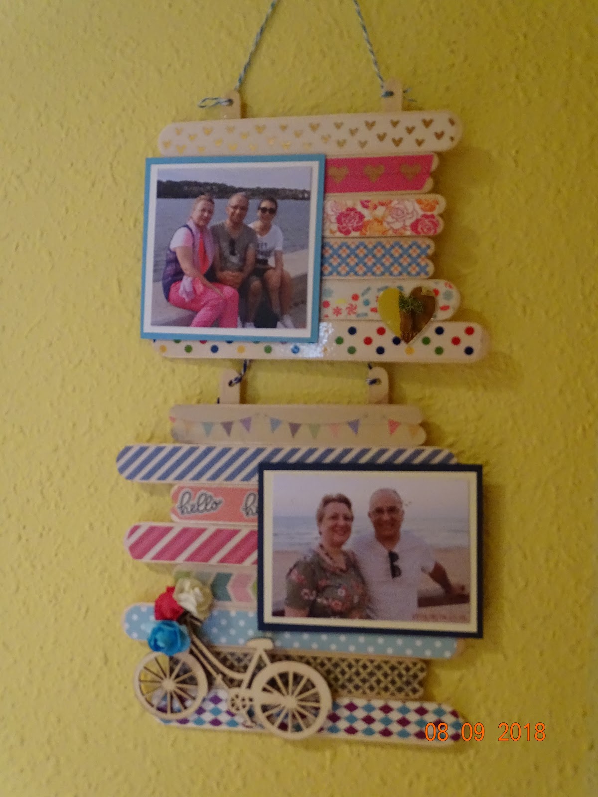 Lo he decorado con dos fotos que he enmarcado en dos tonos de cartulina.Y unos pequeños adornitos de madera y florecillas.