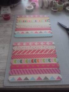 Hoy os enseño una manualidad muy fácil de hacer, incluso para hacer con los niños.Se trata de palitos de helado, que hemos puesto cintas de washi tape de diferentes colores, y lo he pegado por detrás con cinta de carrocero y un trozo de cartulina para afianzar la base.