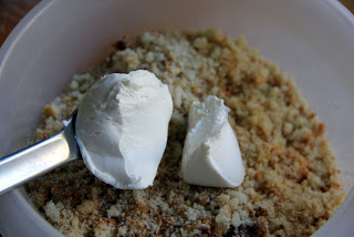 Primero se deshace el bizcocho como una harina y se añade la crema de queso, mezclando hasta que se haga una masa.