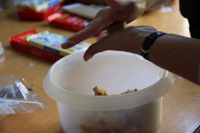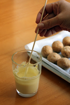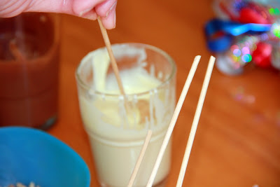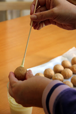Una vez que estén hechas las bolitas, llevar al congelador por 30 minutos. Una vez que las saques, un poco por ver para mantener la temperatura, derrite una parte de una de las barras de chocolate. He utilizado palillos para brochetas, cortando unos centímetros del final afilado. Se moja uno de los lados en el chocolate.
