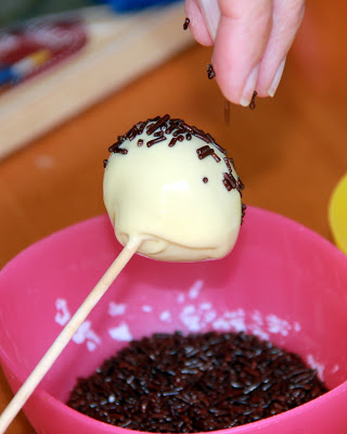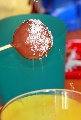 Sumergir cada bolita en el chocolate derretido y decorar inmediatamente, como ya están congeladas el chocolate se seca rápidamente.