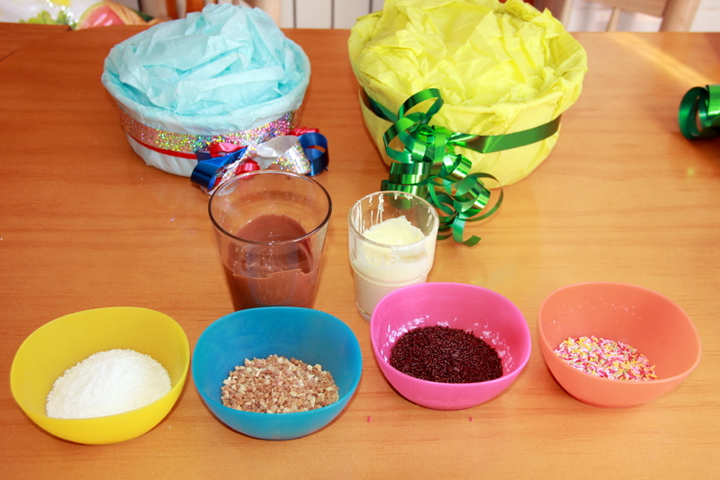 Organizarse para decorar. Derretir el chocolate, ahora puedes hacer una barra por vez. Organizar algunas decoraciones y un bol u otro recipiente decorado para ser la base. Para colocar los pinchos, yo he utilizado unos trozos de espuma de poliestireno y los he cubierto con papel de seda.