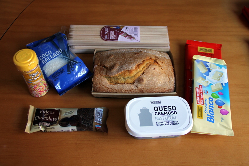 Una Coca de Azucar, pueden ser magdalenas también en cantidad proporcional 1 tarrina de crema de queso fideos, colorines para tarta, coco rallado, nueces picadas (un poco, a tu gusto) Chocolate blanco, con leche o negro (una barra para cada 10-12 pops) Esta receta ha cundido 50 cake pops. Palos para brochetas