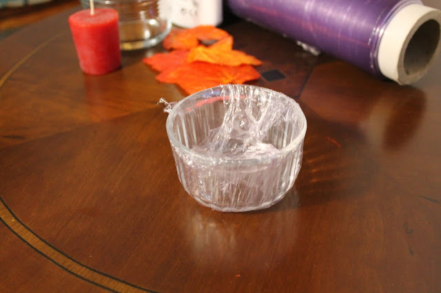 Este fue mi resultado: Una vez que esté seco, despega del plástico film y sepáralo del cristal. Y ahora es cuando entra tu imaginación. Yo, además de la vela, coloqué unas piñas y algunas cositas otoñales.
