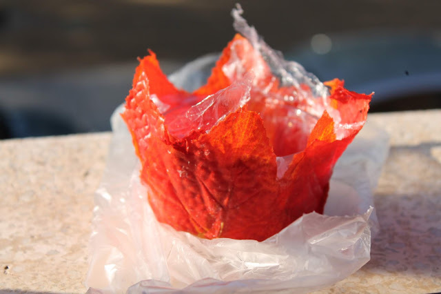 Ahora empezamos a pegar las hojas, cubriendo todo por fuera, y en la primera capa de hojas pondremos el pegamento por el lado exterior de la hoja, para que que en el interior del porta-velas quede la vista de la hoja por la parte exterior, y en la segunda capa, pondremos el pegamento por la parte interna de la hoja, para que al pegarla quede a la vista el lado superior.