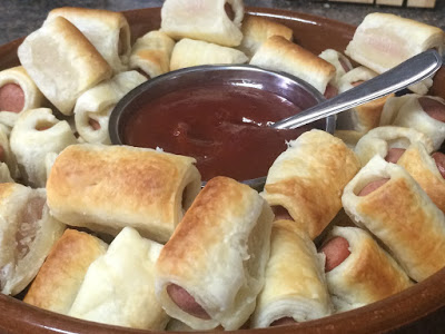 Son salchichas cóctel enrolladas en hojaldre o alguna receta de pan casero.  Doy un paso a paso con fotos en mi blog personal: Paso a Paso