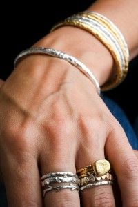 Puedes usar  una misma pieza en diferentes colores en el caso de los anillos. Se trata de buscar anillos iguales o parecidos, su look quedará chic. También puedes decantarte por combinar anillos de plata con pulseras o collares de oro del mismo estilo.