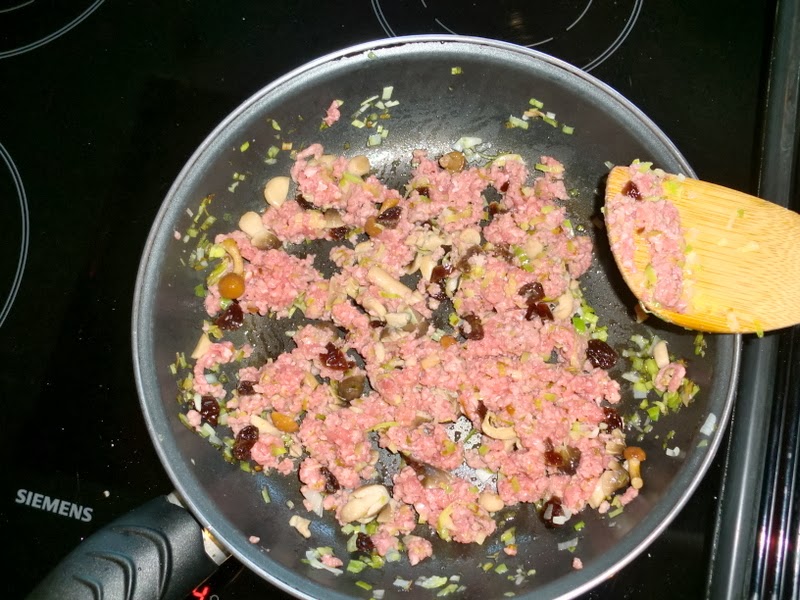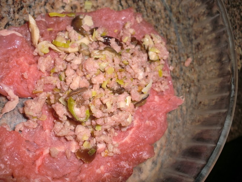 Ingredientes: 1kilo de solomillo 2 puerros un poco de cebollino una cucharada de pasas de corinto 300 gr. de carne picada 100 gr. de champiñones
