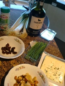 4) Preparamos la salsa de Oporto: en un cazo ponemos más o menos media botella de vino de Oporto a fuego a que se reduzca, y mientras tanto picamos finamente en juliana las cebollas, la pochamos en una sartén con una cucharadita de aceite de oliva, sazonamos y dejamos en el fuego removiendo de vez en cuando y cuando veamos que ya tomaron color, que están caramelizadas, entonces ya agregamos el vino que esta en el fuego que habrá reducido a casi la mitad. Dejamos a fuego un poco más, después licuamos en la minipimer para hacer una salsa con textura sedosa.