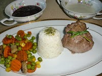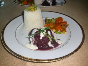 Y cuando la carne ya esta lista, la servimos y echamos las salsas calientes por encima de la carne y acompañamos con arroz blanco y un salteado de verduras.