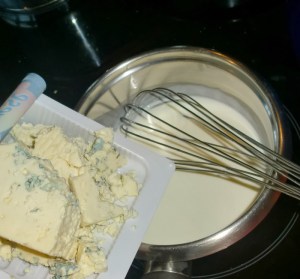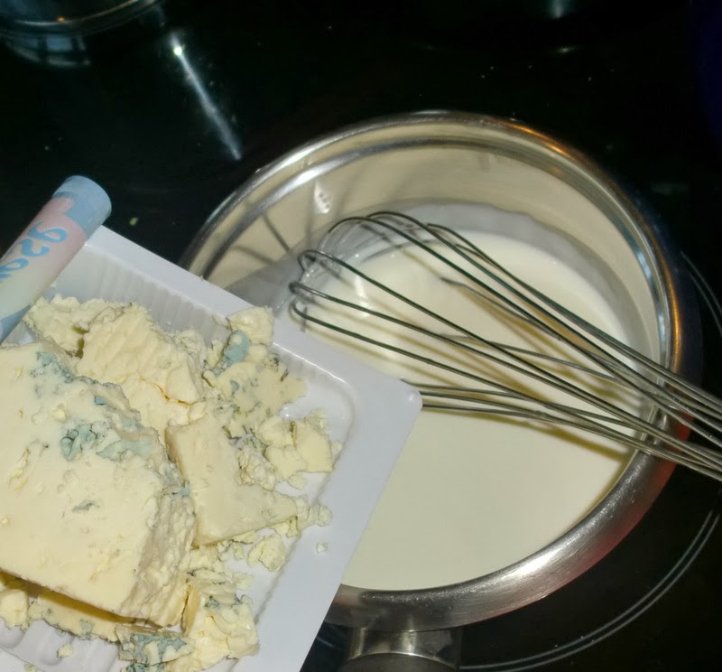 3) preparamos la salsa de queso azul o roquefort: ponemos la nata enn un cazo a fuego, y cuando esté caliente añadimos el queso azul en trocitos y mezclamos con la ayuda de una espátula o varillas para ayudar a incorporarse bien, removiendo dejamos que el queso se derrita, que se desintegre en la nata lentamente, salpimentamos y opcional: (una pizca de nuez moscada). apartamos del fuego.