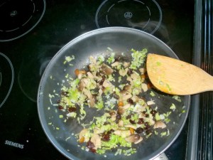 2) Preparamos un sofrito con los puerros cortados finamnete, en una sartén ponemos una cucharadita de aceite de oliva y pochamos los puerros. Cuando tomen color añadimos las pasas, y los champiñones, removemos un par de minutos.
