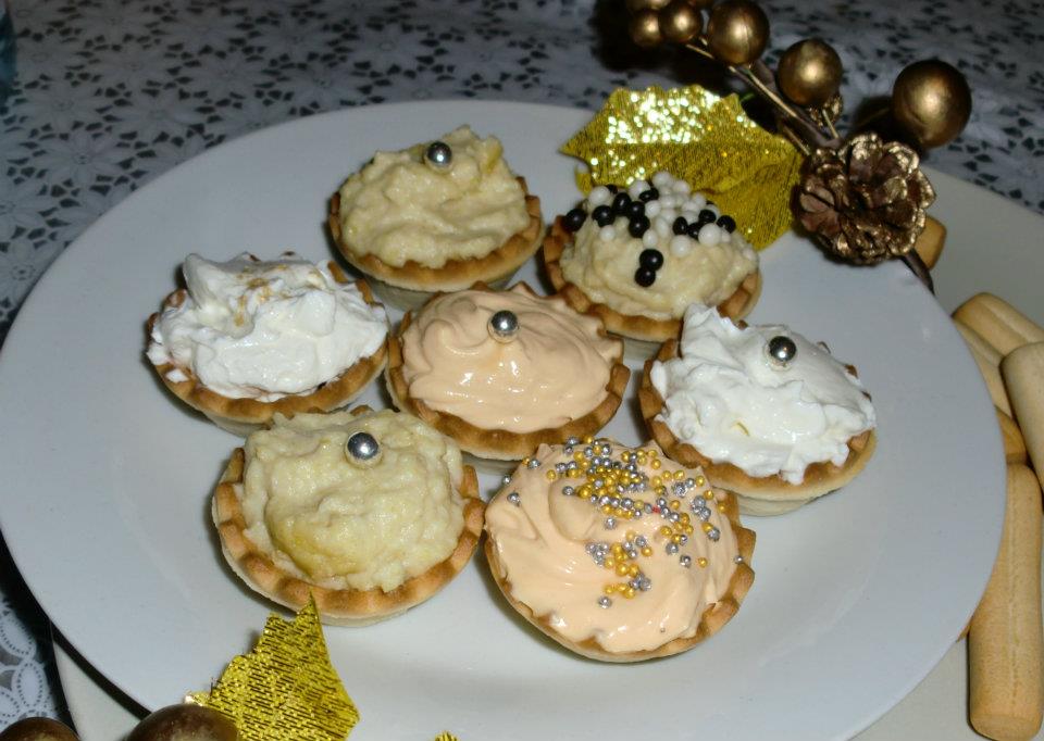 Compraremos tartaletas que las venden en cualquier tienda o supermercado, las venden en paquetes de 6, 8 y 16, y nuestro relleno puede ser dulce o salado, por ejemplo si las queremos rellenar saladas, podemos rellenarlas de el pate que más nos guste, de sobrasada, de queso philadelphia, de dip de alcachofa o de cualquier otro y para decorar con media aceituna. Y si el relleno lo queremos dulce; puede ser de crema pastelera y decorarla con cerezas en almíbar, o con uvas, frutos secos o frutillas. Las fotos arriba son de las que hice las navidades pasadas.