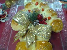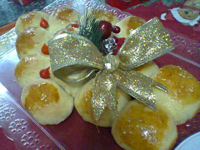 Disuelva la levadura en la sal y el azúcar, agregar los huevos, la margarina, el ajo, la cebolla y la leche, ir gradualmente poniendo la harina. Trabajar bien la masa. Dejar que la masa crezca hasta que doble su volumen. Hacer las bolas y rellenarlas con el relleno preferido. Con las bolitas, ir formando un «árbol de Navidad». Pincelar con una yema de huevo, espolvorear con queso parmesano y ajonjolí. Hornear hasta que esté dorado.