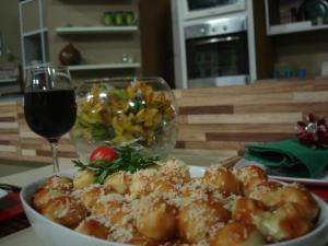 Prepara: hervir el agua con el caldo, margarina, y patata. Retirar del fuego y añadir la harina de una sola vez. Poner en una superficie limpia para trabajar la masa. Trabajar con las manos por unos 2 minutos. Haga bolitas de unos 3 cms de diámetro, rellenando con la mozzarela. Ir poniendo las bolitas en un recipiente de horno. Al terminar, cubrir con la salsa de tu preferencia y llevar al horno para derretir el queso. Servir acompañado con queso parmesano.