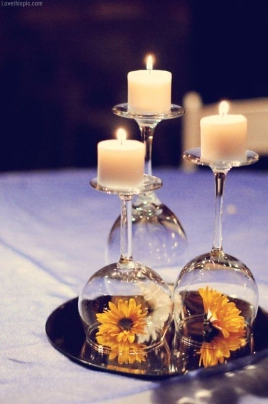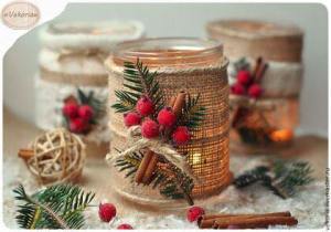 Para los porta-velas podemos utilizar copas de cristal, botes de cristal, tapas de los botes, etc- Y para decoración hilos de rafia, lana, puntillas, cintas de raso, flores secas, palitos de canela, adornitos de navidad, piedrecitas, arena, conchas de mar, etc.