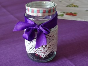 1) potes reciclados de vidrio 2) retales de cintas 3) flores de papel 4) pistola de pegamento 5) tijeras 6) botones, lentejuelas y otras decoraciones 7) una vela pequeña normal o de led