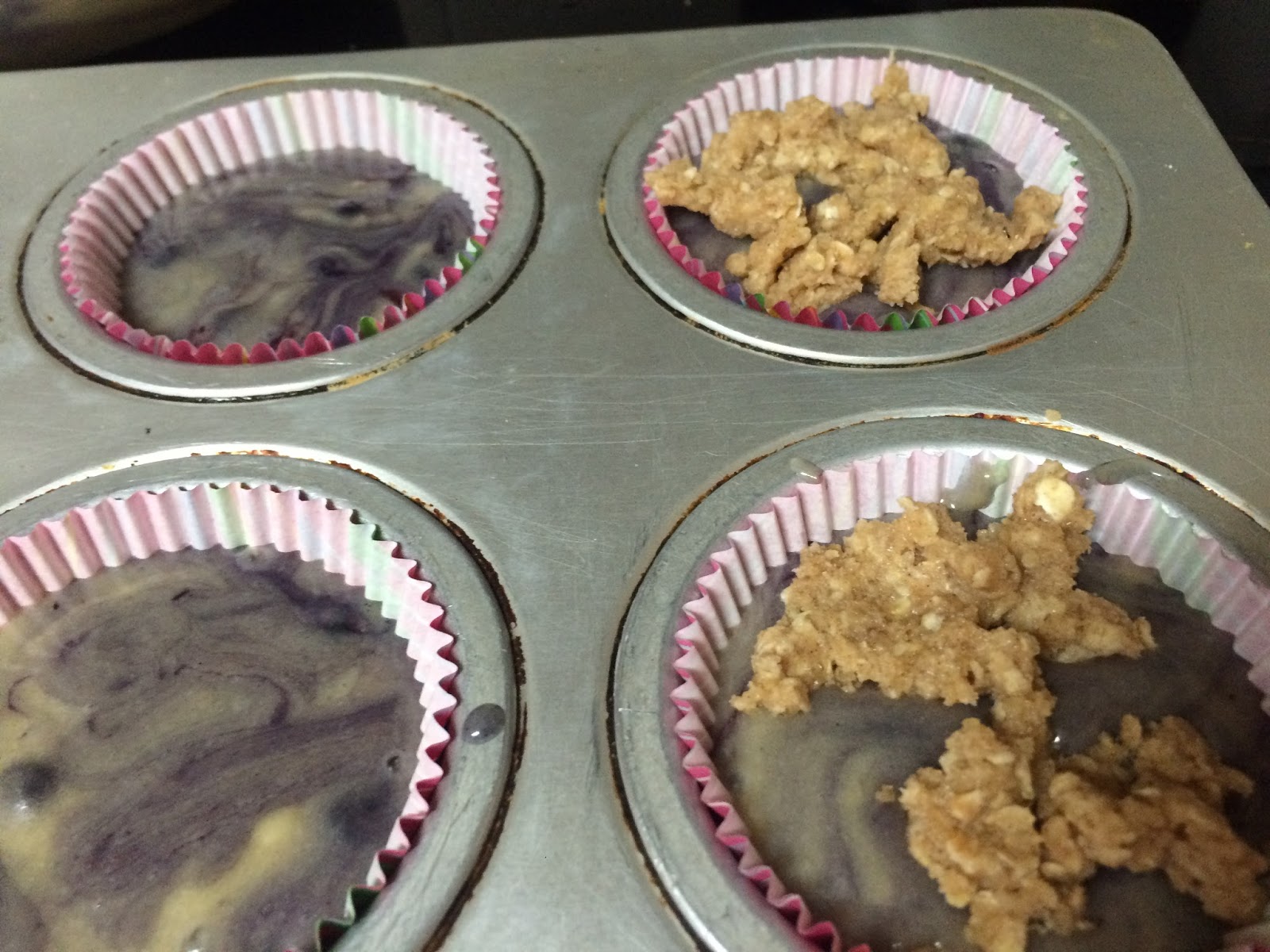 Mezclar ingredientes secos y ir adicionando la mantequilla poco a poco. Adicionar irregularmente por encima de la masa de los muffins.