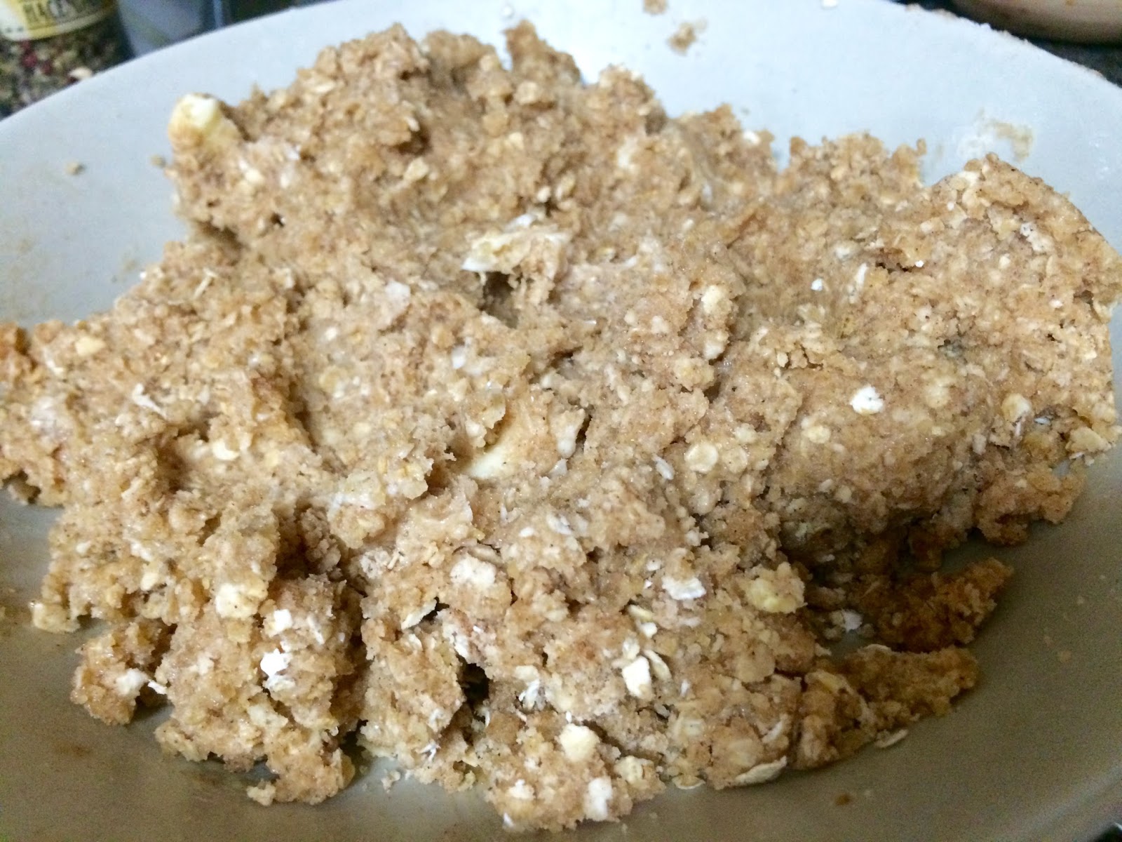 Mezclar la mantequilla con los azúcares. Una vez mezclado, añadir harina, avena, bicarbonato, sal, canela, nuez moscada y las nueces. Puedes usar una batidora. Yo lo he mezclado con una espátula. Dividir la masa en dos y cubrir el fondo del recipiente con una de las mitades, distribuyendo igualmente por todas partes. Asar en horno precalentado a 180º C por 10 minutos.