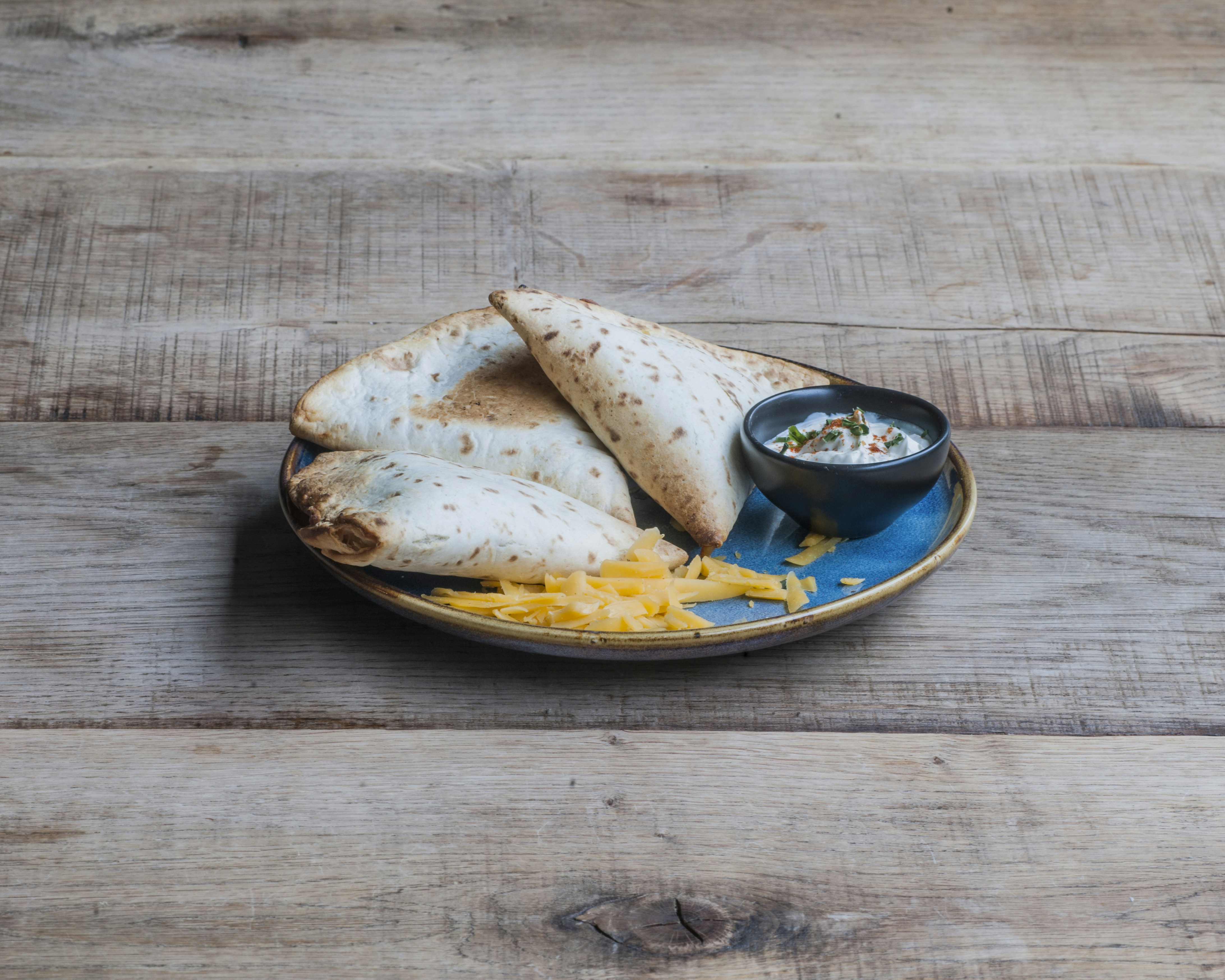 Tortilla mexicana relleno de huevos revueltos o rellenado con el queso preferido del niño, a la plancha.