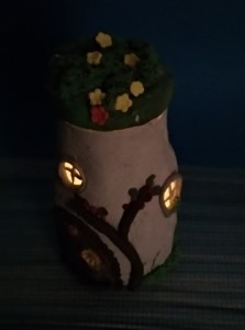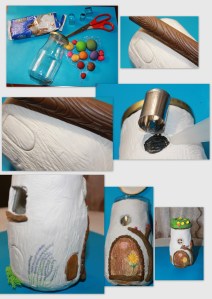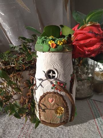Lo primero que hay que hacer es forrar o envolver el frasco con la arcilla, no necesita pegamento, se pega por si sola. Puedes ayudarte con moldes para añadir elementos, o usar texturizadores, como yo en este caso use un palo para darle textura de madera, pinté unas pequeñas flores de lavanda … tú lo que te dicte la imaginación.