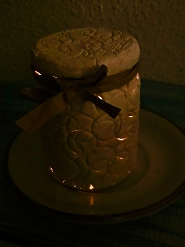 Dejamos secar. A continuación, hacemos el esténcil con la pasta de relieve en la tapa dejando secar bien el relieve.