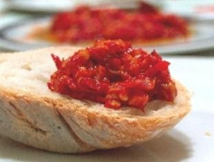 6 pimientos rojos, maduros, sin semillas … asados. 3 dientes de ajo1 cebolla grande500 grs. de sardinas sin piel y sin espinas, cocidas1 lata pequeña de tomate frito1 taza (tamaño americana) aceitesal y pimienta roja al gusto. Pasar todo por un procesador y listo. Se puede servir con pan y crackers o con pasta.