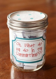 2. A veces pensamos, que el verano es el tiempo en que cada cual hace lo que quiera con el tiempo libre. PERO, no tardarás en escuchar la famosa frase » me aburro» por alguno de tus niños. Para tales momentos, yo recomiendo un recipiente con la siguiente frase: «Cosas que hacer cuando me aburro». Tienes que entrar en un acuerdo que cuando sea el momento, ellos tienen que hacer lo que dice el papelito. Tú también tiene que estar lista para lo que te toque hacer o preparar en este momento.