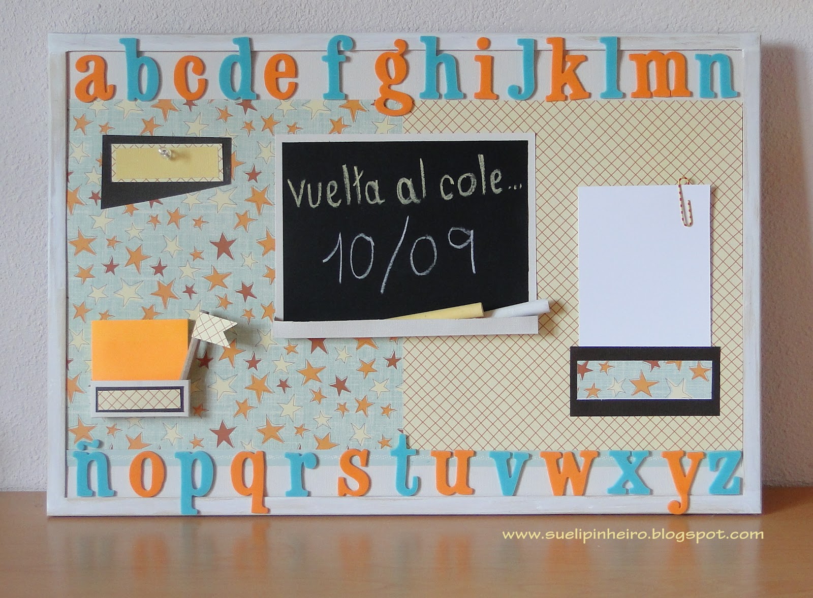 En cartulina negra, un cuadro de tiza donde se puede escribir y borrar. Por la izquierda una cajita con el post- it y con un lápiz (estos de Ikea) y por la derecha un bolsillo para estos papelitos, tantos que tenemos siempre. Todavía resta espacio libre para el calendario y otras cositas más.