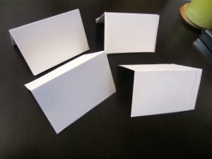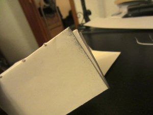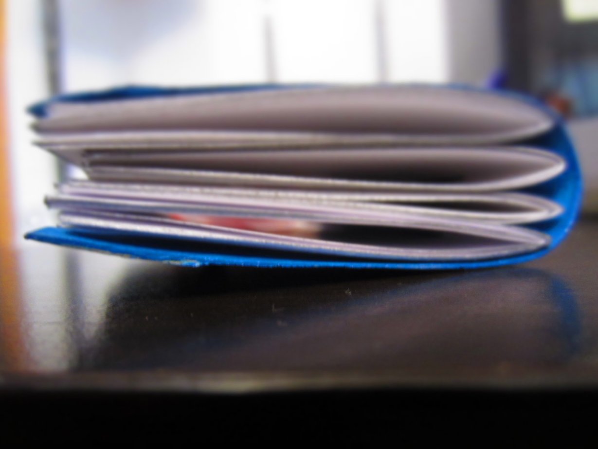Se corta el papel en rectángulos un poco más pequeños que el rollo de papel. Estos miden aproximadamente 8.5cm por 12.5cm. Corté 16 y los separé en cuatro libritos de cuatro paginas.