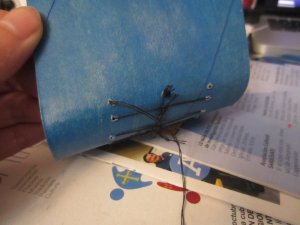Se une un librito a la vez al rollo de papel. Espero que estas dos fotos puedan explicar el proceso. Se repite con los cuatro libritos.