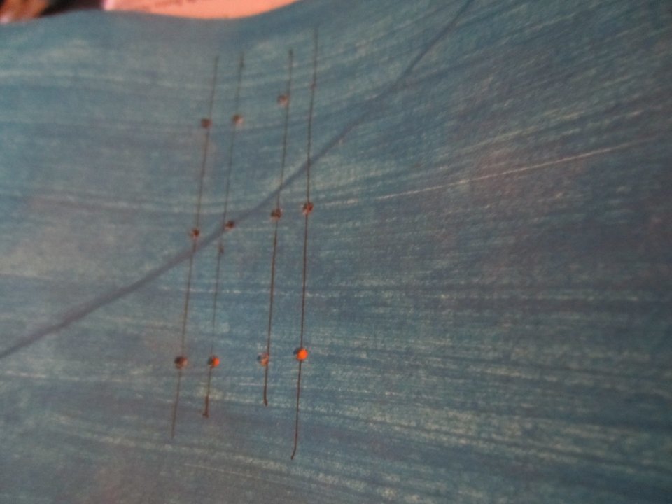 Para darle un toque de contraste, le puse un poco de color a la orilla con tinta. Usando una chincheta, se hacen tres agujeros: uno en el centro y los otros aproximadamente a 2 cm por arriba y por abajo.