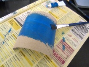Primero se corta el rollo para poder aplanarlo un poco y se pinta por las dos caras. El mío lleva el mismo color, pero quizás el próximo será diferente. ¡Me encanta este tono de azul que encontré! (Para proyectos pequeños como éste, uso la guía telefónica para proteger mi mesa y voy arrancando las hojas usadas.)