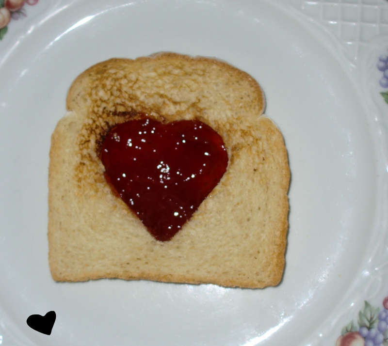 Prepararemos las tostadas de todos los días, pero marcamos la forma de corazón con un cortador de galletas, y lo rellenamos de mermelada de fresa.
