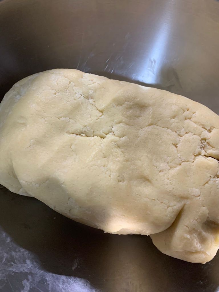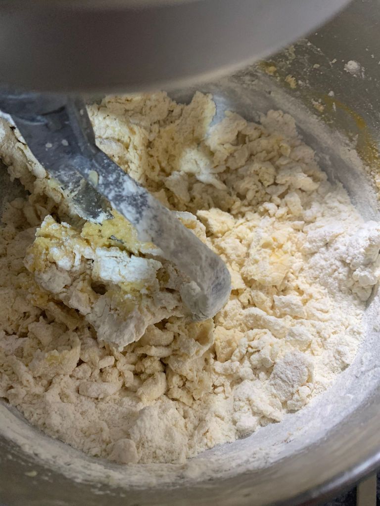 La masa estará́ desmenuzada, amasarla con las manos mientras la sacas del tazón para enrollarla.