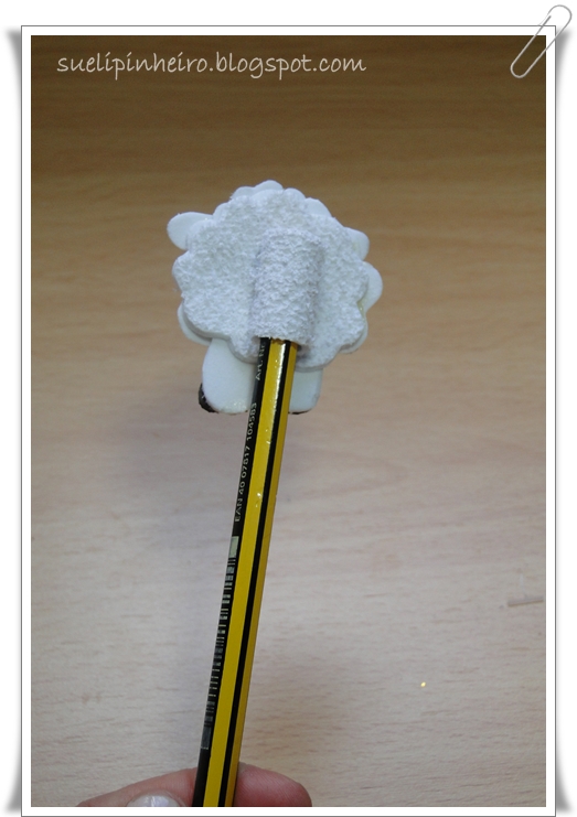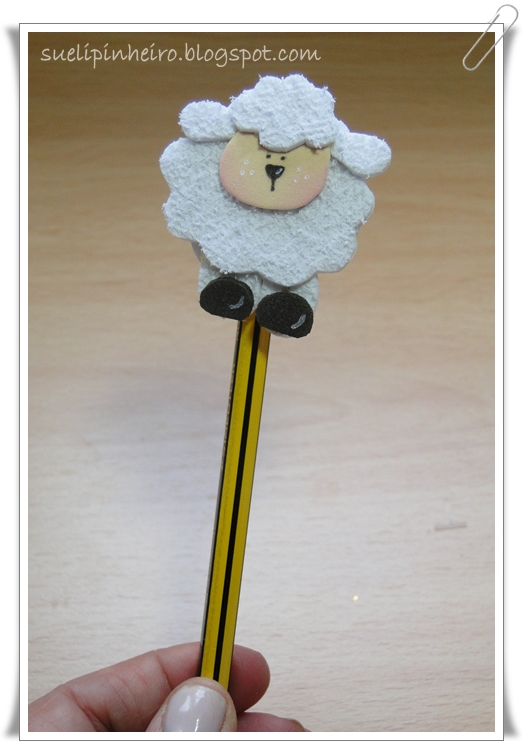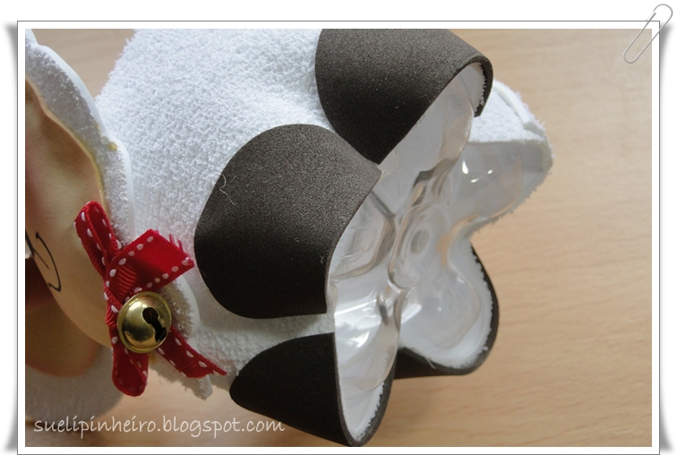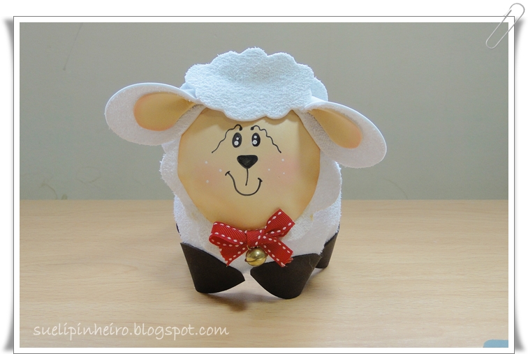 Esta ovejita está hecha con goma EVA, me la compré en una tienda de chinos. Utilicé una botella de Coca cola, le recorté la parte de abajo y la cubrí con la goma EVA.