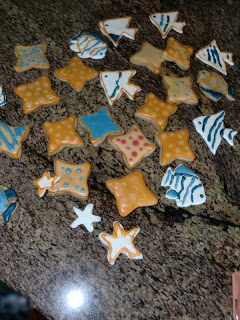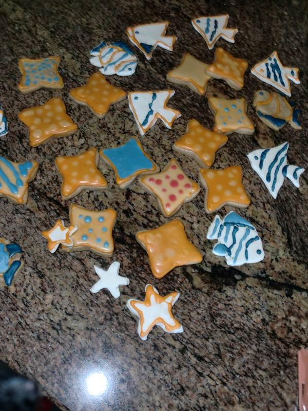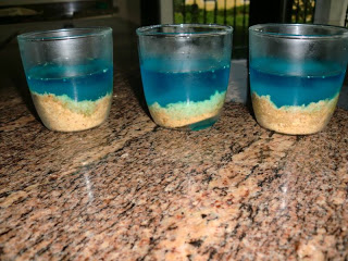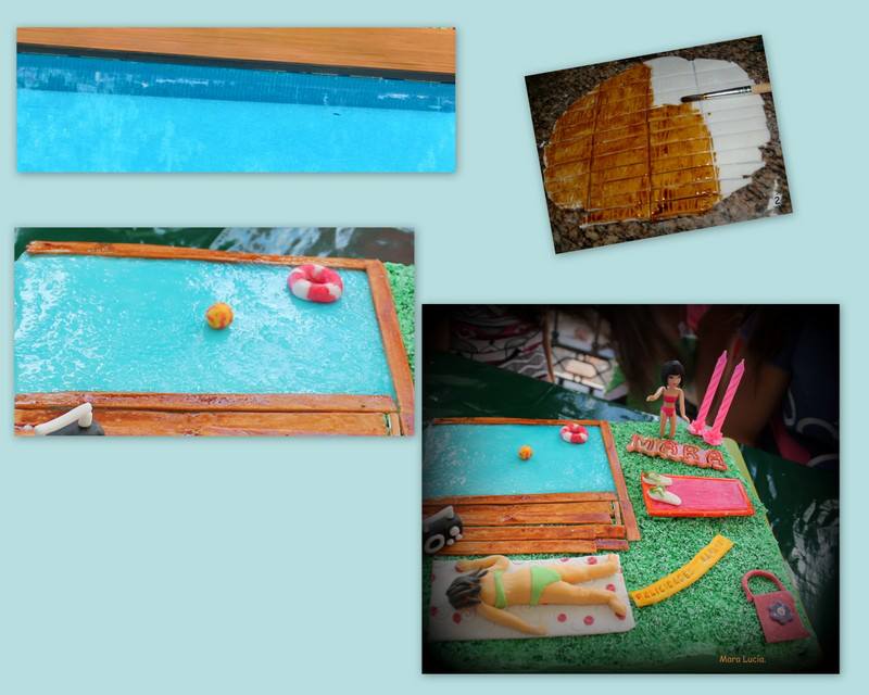 Receta para hacer el efecto Arena y agua; para hacer arena triturar y licuar galletas Maria doradas y restos de bizcocho (hecho días antes porque tiene que estar seco), después de molido tiene que tener aspecto de arena, y si el color no se le parece entonces debemos de poner una o unas gotitas de colorante marrón claro o el que quede mejor. Para el efecto agua; hidratamos 2 cucharadas de gelatina neutra, en 5 cucharadas de agua fría, dejamos por 5 minutos. Después calentamos 2 tazas de jarabe de maíz (miel Karo) y agregamos la gelatina neutra hidratada y removemos hasta que se disuelva totalmente, pero debemos dejar hervir, retiramos del fuego y agregamos el colorante azul, mezclamos muy bien con una cuchara y dejamos enfriar, cuando esté ya frío decoramos la tarta.