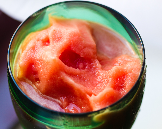 2 tazas de sandía congelada 1 plátano maduro grande 2 cucharadas de jarabe de agave (o jarabe de arce) 4 cucharadas de zumo de lima (aproximadamente 2 limas) 1/2 cucharadita corteza de lima 1/2 taza + agua según sea necesario para conseguir mover la batidora. Opcional: un chorrito de cayena para un sabor picante Opcional: unos cubitos de hielo para un helado extra – Me gusta usar cubitos de hielo de agua de coco